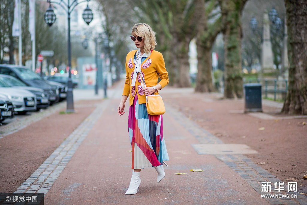 ??? 近日,德國杜塞爾多夫,時尚博主Gitta Banko街拍。她戴Miu Miu茶色墨鏡,身穿Steffen Schraut橘色亮片拼貼針織開衫,內搭Steffen Schraut白色蝴蝶印花系帶雪紡襯衫,Steffen Schraut拼色百褶紗裙,肩背Volker Lang橘色口金包,腳踩Kurt Geiger白色尖頭高跟短靴。