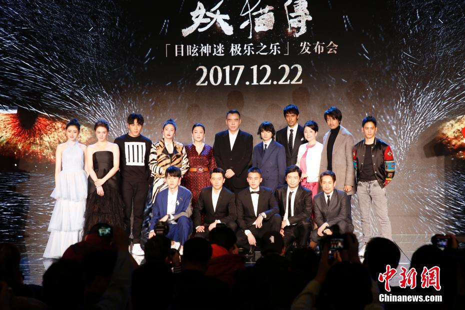 12月17日,由陳凱歌導(dǎo)演的賀歲奇幻題材電影《妖貓傳》在北京舉行全球首映發(fā)布會,導(dǎo)演陳凱歌,制片人陳紅攜主演黃軒、染谷將太、張雨綺、秦昊、張榕容、張魯一、劉昊然、阿部寬、松坂慶子等亮相。影片改編自日本作家夢枕貘的魔幻系列小說《沙門空?!?,將于22日起在中國內(nèi)地上映。圖為眾主創(chuàng)合影。
