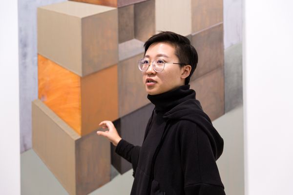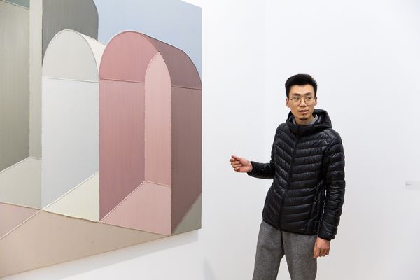 藝術家趙新宇,1989年出生于內(nèi)蒙古,2012年畢業(yè)于四川美術學院油畫系。趙新宇最早的創(chuàng)作,即為人所知的“車廂”系列,涉及了一種日常經(jīng)驗,后續(xù)階段的作品以情緒性和敘事性為底色,而使得整個畫面頗具戲劇色彩。在新作當中,這一痕跡的延伸則是趙新宇似乎試圖通過對畫面結構的編排,對比之前的作品,依舊是在構景,但卻在逐漸在取締物的現(xiàn)實性因素。新作當中技法的轉(zhuǎn)變,厚涂式的平推僅保留了一部分,新作當中的轉(zhuǎn)向在某種程度上僅僅構成了對于厚涂畫法的一個對立面發(fā)生,像是一次新的開場,畫面本體基本問題再次噴涌而來,在這一情形下,趙新宇通過對于框架結構式描繪的轉(zhuǎn)向,試圖引向一種對于畫面心理的感知。