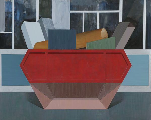 趙新宇作品當中的圖式來源,無論是從攝影作品中或者裝置作品中抑或現(xiàn)實當中選取某個場景的邊角,從某種程度上,均服從于他個人基于謹慎的、甚至敏感的內(nèi)在壓制,正如《室外2#容器》背景的窗框,稱其為窗框,倒不如把它當作畫面整體結構的一個同級邏輯走向,正如同置放在背景前的所謂“容器”當中的幾何體,是幾何化了的現(xiàn)實物與根據(jù)畫面再行部分添加的合奏,在某種程度上,也可以說是塞尚繪畫理念的一則變異體。