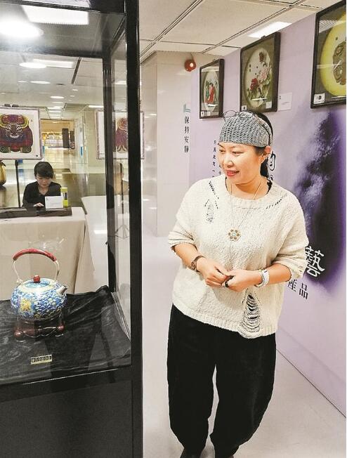 展臺(tái)前的景泰藍(lán)銀器茶壺精致漂亮,典雅高貴,它的制作者山西銀滿樓景泰藍(lán)公司技術(shù)總監(jiān)吳鳳芳在景泰藍(lán)行業(yè)已經(jīng)耕耘36年。她在上世紀(jì)90年代成功將傳統(tǒng)的銅胎掐絲景泰藍(lán)革新品種,研制成功銀胎掐絲琺瑯,并于2012年獲得的國家技術(shù)發(fā)明專利。