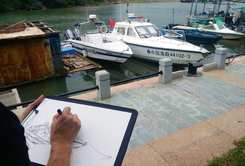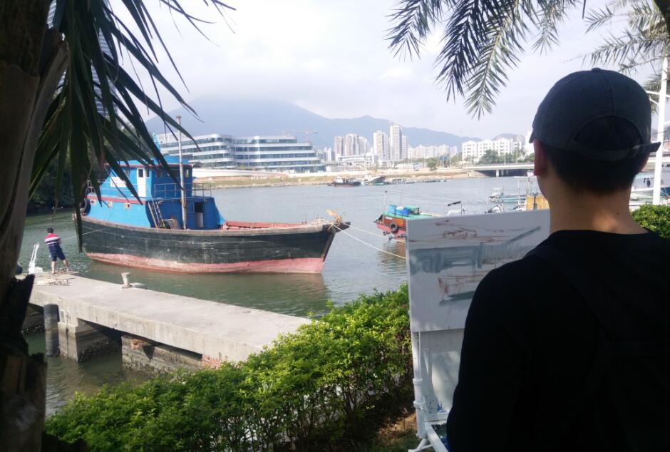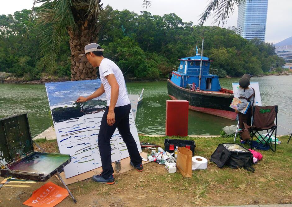 優(yōu)美的景色映入畫家們眼簾,點燃了他們的創(chuàng)作激情。來到鹽田之后,藝術(shù)家們紛紛找好寫生地點,擺好畫架,迅速進(jìn)入創(chuàng)作的狀態(tài)。他們當(dāng)中一部分來到了鹽田漁港,鹽田海鮮街后的小漁村避風(fēng)港。蔚藍(lán)的大海、旁邊的綠樹、避風(fēng)塘內(nèi)停泊的船只、白色的海鳥、釣魚的人以及遠(yuǎn)方火熱的建設(shè)場景都呈現(xiàn)在畫家的筆端;另一部分藝術(shù)家來到了位于三洲田深圳會計進(jìn)修學(xué)院的梧桐溪谷,小橋流水人家、奇石山林則一一被傾注于畫紙。
