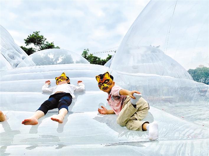 在本屆鳳凰花嘉年華主會場——華僑城體育文化中心綠地空曠自然的草坪上,由本土新銳建筑設(shè)計師黃澤林設(shè)計和創(chuàng)作的巨型充氣建筑“空氣山”拔地而起。人們可以自由地在“空氣山”的多維表面上嘗試坐、臥、立、躺的體驗(yàn)。而張凱琴、張齊努、劉小青三位國內(nèi)知名自然藝術(shù)家即興創(chuàng)作的“歇腳云”等自然裝置,通過空間藝術(shù)作品與公眾的互動,喚醒著人們對自然的熱愛。