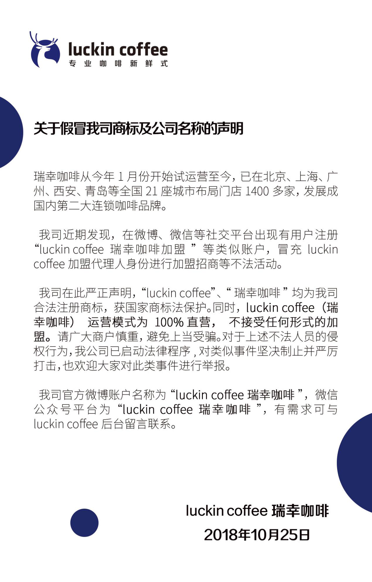 深圳新聞網(wǎng)訊 近日,瑞幸咖啡官宣聲明:我司近期發(fā)現(xiàn),在微博、微信等社交平臺(tái)出現(xiàn)有用戶注冊(cè)“l(fā)uckin coffee瑞幸咖啡加盟”等類似賬戶,冒充luckin coffee加盟代理人身份進(jìn)行加盟招商等不法活動(dòng)。luckin coffee瑞幸咖啡堅(jiān)持運(yùn)營(yíng)模式為100%直營(yíng),不接受任何形式的加盟,請(qǐng)廣大商戶慎重,避免上當(dāng)受騙。