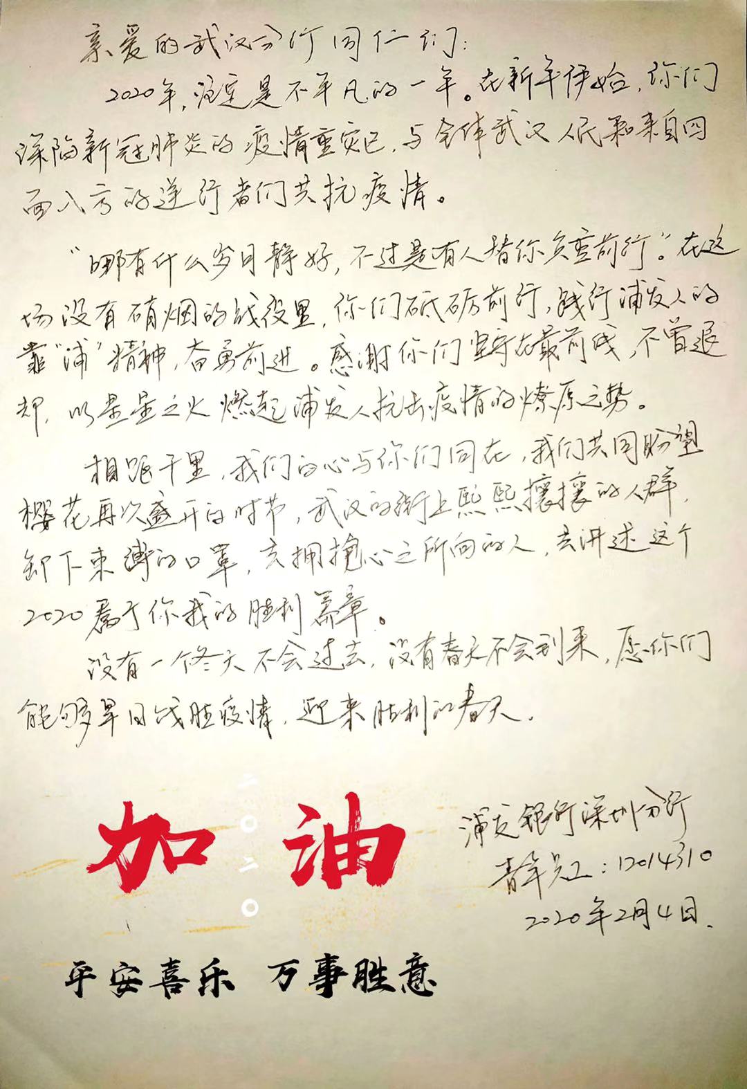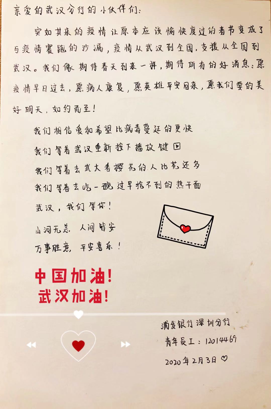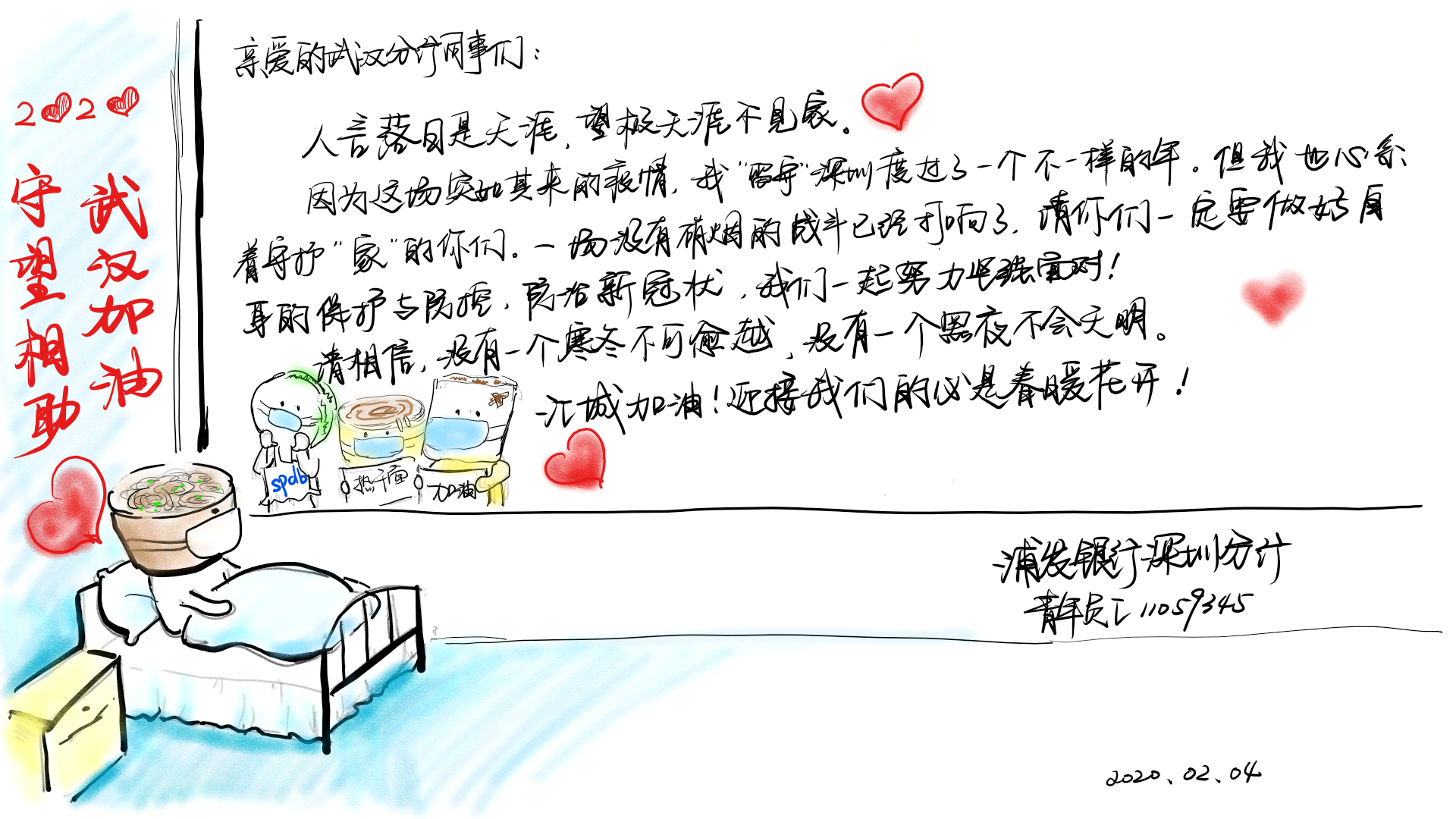 2月3日,浦發(fā)銀行深圳分行團委向全體青年員工發(fā)出了一封倡議書。在倡議書中,該行團委號召廣大團干部、團員青年立即行動,充分發(fā)揮黨的助手和后備軍作用,展現(xiàn)青年突擊隊作為,為堅決打贏疫情防控阻擊戰(zhàn)貢獻力量,并向青年提出三個要求:“堅定信心不迷茫,聽黨指揮勇?lián)敗?、“科學防范不信謠,眾志成城控疫情”、“居家辦公不離崗,服從指揮勇?lián)敗薄.斎?,浦發(fā)銀行深圳分行發(fā)起了給武漢分行同事寄送家書的活動,該行全體青年手寫家書,圖文并茂、紙短情長,表達了對疫區(qū)“戰(zhàn)友們”最深切的關(guān)愛和鼓勵,身體力行做好他們堅強的后盾。