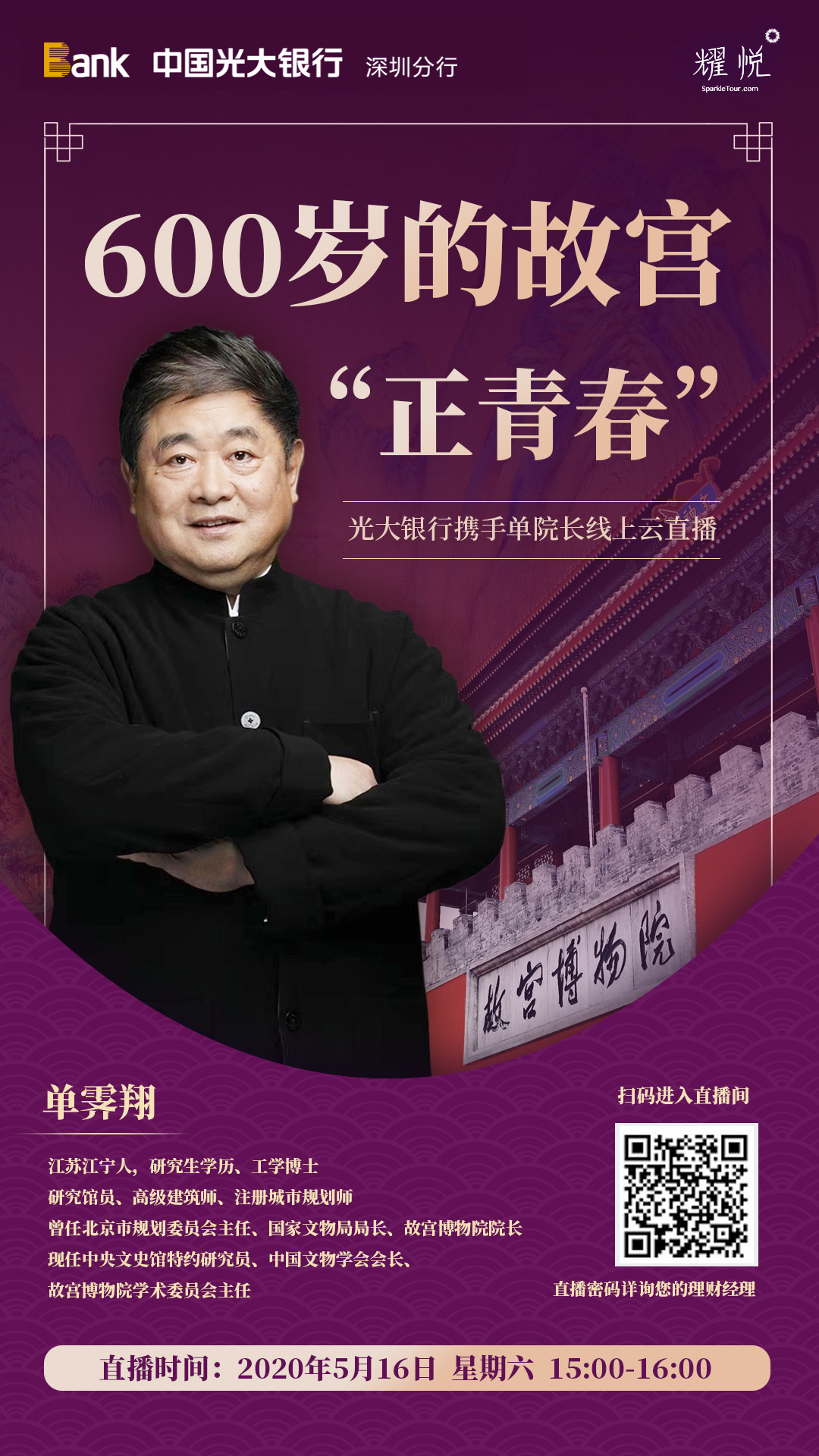 深圳新聞網(wǎng)2020年5月15日訊 他要來了,帶著600歲故宮的青春故事來了,來到《光大銀行“開講啦”!》第十二期。為了回饋客戶,讓廣大客戶更深入體會(huì)到故宮之美,光大銀行深圳分行特邀請(qǐng)?jiān)蕦m博物館單霽翔院長(zhǎng),于5月16日(周六)下午3點(diǎn)-4點(diǎn)線上開講精彩課程《600歲的故宮“正青春”》,讓參與者從多個(gè)角度體驗(yàn)傳統(tǒng)文化之美。