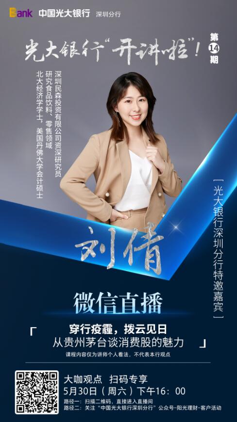 此次,光大銀行深圳分行攜手鳳凰深圳財(cái)經(jīng),邀請(qǐng)到北大經(jīng)濟(jì)學(xué)碩士、美國(guó)丹佛大學(xué)會(huì)計(jì)碩士、深圳民森投資有限公司資深研究員劉倩女士,在線(xiàn)為客戶(hù)帶來(lái)《穿行疫霾,拔云見(jiàn)日——從貴州茅臺(tái)看消費(fèi)股的魅力》主題分享。據(jù)悉,劉倩女士關(guān)注于食品飲料、零售領(lǐng)域的投資研究。此次分享,她以眾所熟知的茅臺(tái)酒為案例,結(jié)合A股2000年至2018年漲幅數(shù)據(jù)、茅臺(tái)歷史、品牌發(fā)展、銷(xiāo)售渠道、市場(chǎng)占有等多方面,介紹孕育牛股搖籃的消費(fèi)股投資邏輯,幫助更多客戶(hù)在全球受疫情沖擊、經(jīng)濟(jì)不確定時(shí)期,了解A股牛股市場(chǎng)邏輯、知曉投資策略提升個(gè)人資產(chǎn)。