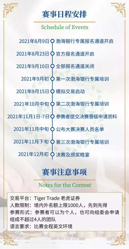 活動(dòng)冠名方——渤海銀行希冀以本賽事的舉辦為契機(jī),通過(guò)緊張激勵(lì)而又活潑有趣的模擬投資組合競(jìng)賽形式、寓教于樂(lè),樹立并培養(yǎng)青年一代對(duì)于財(cái)富增長(zhǎng)與傳承的正確理念,引導(dǎo)年輕人理解并實(shí)踐綠色投資,促進(jìn)青年一代“財(cái)商”理念與能力的全面提升。