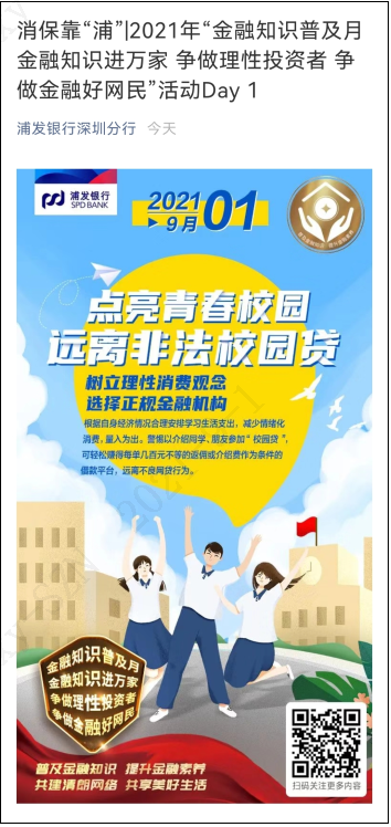 9月1日,也是校園開學(xué)的日子。開學(xué)的第一天,浦發(fā)銀行深圳分行特別推出“點亮青春校園遠(yuǎn)離非法校園貸”日歷宣傳海報,并在官方微信公眾號進(jìn)行轉(zhuǎn)發(fā)宣傳,同時在46家網(wǎng)點營業(yè)大廳顯示屏播放,重點傳播校園貸金融知識,提醒學(xué)生人群,合理消費(fèi),遠(yuǎn)離不良網(wǎng)貸行為。據(jù)悉,該行將在九月每個工作日持續(xù)發(fā)布消保宣傳日歷,常態(tài)化長效推進(jìn)金融知識普及月宣傳活動的開展。