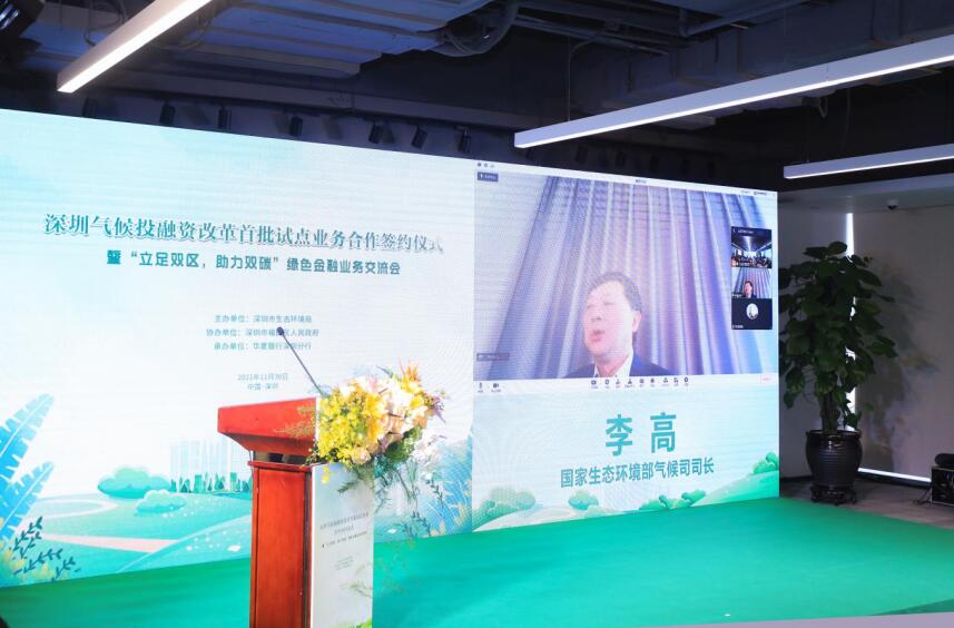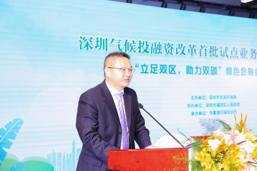 國(guó)家生態(tài)環(huán)境部氣候司司長(zhǎng)李高,深圳市政府副秘書(shū)長(zhǎng)劉昂,深圳市生態(tài)環(huán)境局局長(zhǎng)李水生,深圳市委改革辦副主任孫華明,福田區(qū)政府副區(qū)長(zhǎng)朱江,華夏銀行總行黨委委員、營(yíng)銷總監(jiān)、深圳分行黨委書(shū)記、行長(zhǎng)陳傳龍等領(lǐng)導(dǎo)出席。深圳市政府、深圳市生態(tài)環(huán)境局、市委改革辦、中國(guó)人民銀行深圳市中心支行、福田區(qū)政府相關(guān)負(fù)責(zé)人、深圳市綠色企業(yè)代表、深圳市綠色相關(guān)行業(yè)協(xié)會(huì)代表、華夏銀行深圳分行相關(guān)單位代表等70余人參加活動(dòng)。