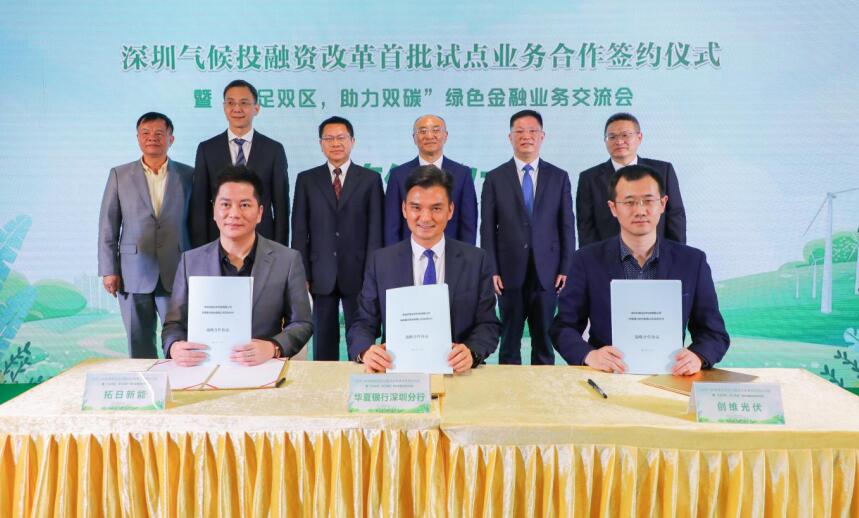 在與會(huì)領(lǐng)導(dǎo)嘉賓的共同見(jiàn)證下,華夏銀行深圳分行分別與深圳市創(chuàng)維光伏科技有限公司、深圳市拓日新能源科技股份有限公司簽署了《深圳氣候投融資改革首批試點(diǎn)業(yè)務(wù)合作協(xié)議》。