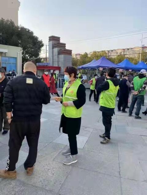 上圖:郭秀芳在街道核酸檢測中負(fù)責(zé)引導(dǎo)協(xié)調(diào)