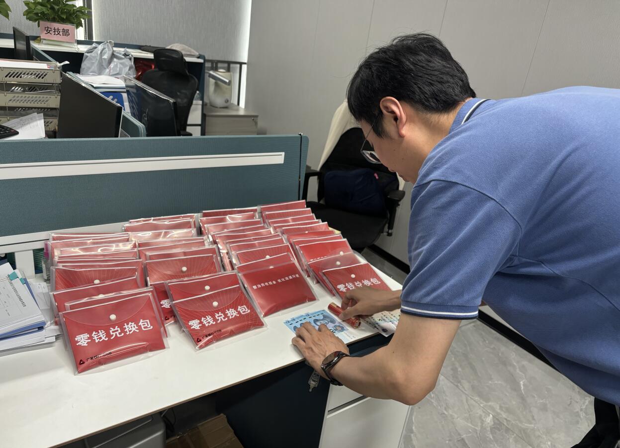 “經(jīng)常碰到老年人或者外國(guó)人打車時(shí)給我一百元的大鈔,可我沒有零錢找啊,需要開到路邊等客戶去便利店或商鋪換零錢。現(xiàn)在廣發(fā)銀行上門來給我換零錢,幫我解決了大問題,可以節(jié)約時(shí)間多接幾個(gè)單,多賺點(diǎn)錢嘍!”出租車司機(jī)李師傅興奮地說道。僅一分鐘,他便兌換好了一個(gè)200元的零錢包。