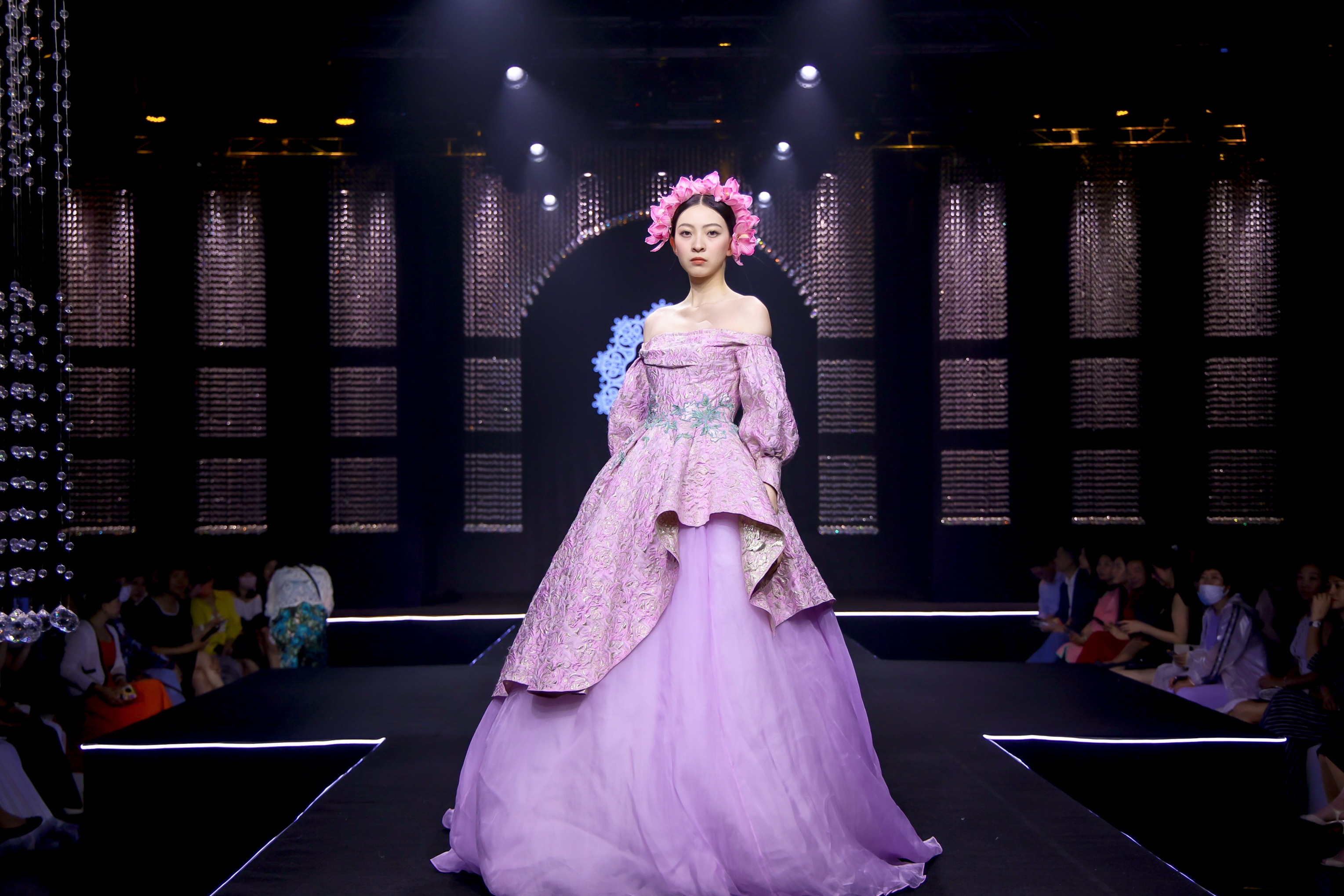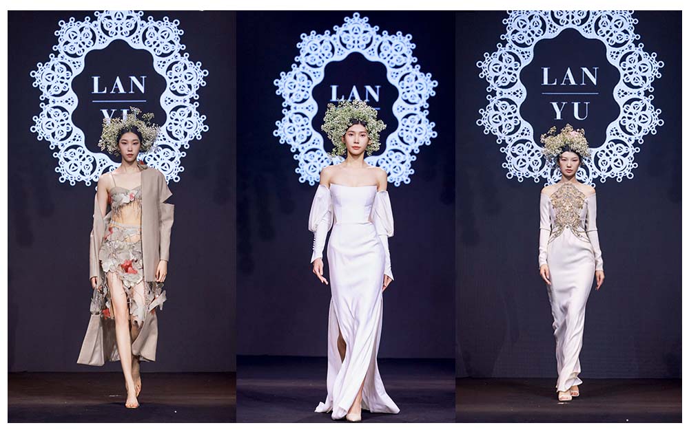 現場更有LANYU高定禮服展示,將中式美學意境與西式時尚剪裁完美融合,同時加重了蘇繡非遺元素的應用比例,將更多的非遺技藝融入服飾創(chuàng)作中,呈現出超高藝術水準。