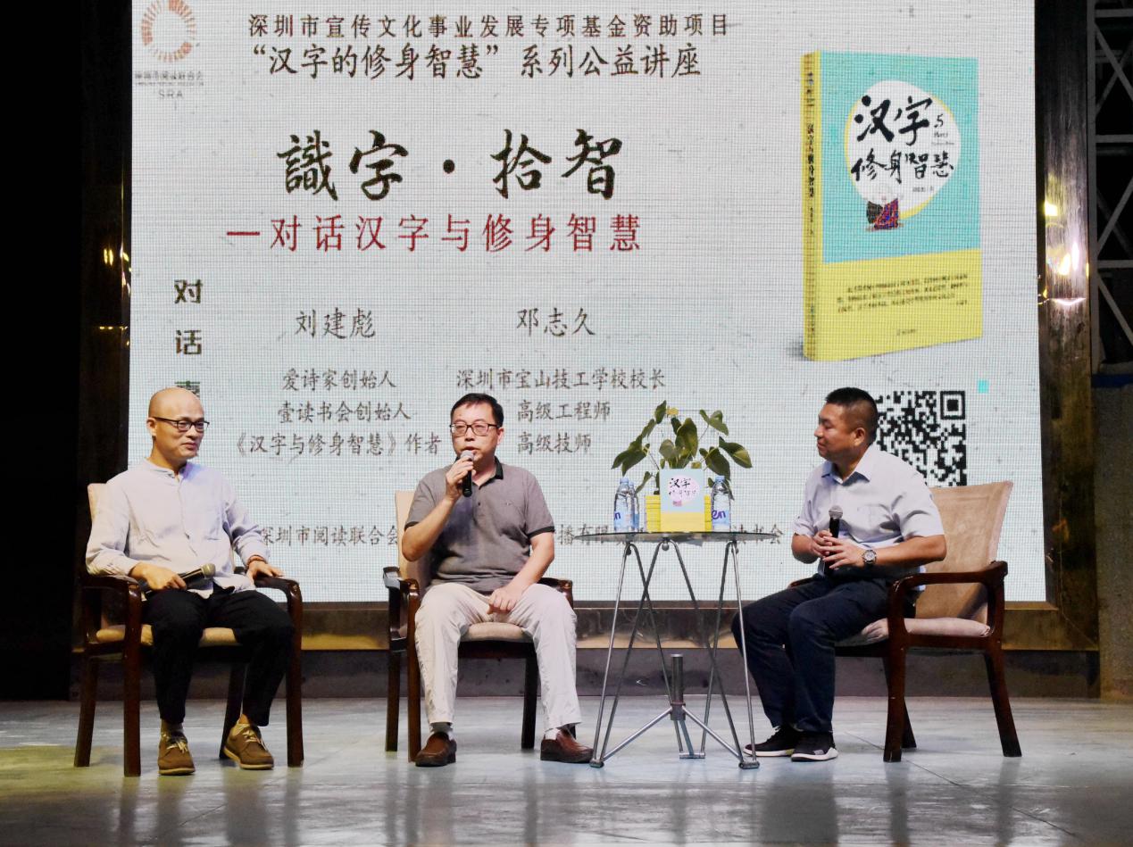 深圳新聞網(wǎng)訊 9月18日晚上7時(shí),由深圳市閱讀聯(lián)合會(huì)、深圳市壹書(shū)文化傳播有限責(zé)任公司和寶山讀書(shū)會(huì)共同主辦的“‘識(shí)字拾智’——對(duì)話漢字與修身智慧”公益文化講座在寶山技工學(xué)校寶山大舞臺(tái)拉開(kāi)了序幕。據(jù)悉,這是由深圳市宣傳文化事業(yè)發(fā)展專項(xiàng)基金資助項(xiàng)目“漢字的修身智慧”的第三場(chǎng)公益文化講座,以劉建彪《漢字與修身智慧》新書(shū)分享為契機(jī),傳播漢字正能量,讓更多的青少年識(shí)字長(zhǎng)智,領(lǐng)略漢字文化之精妙。