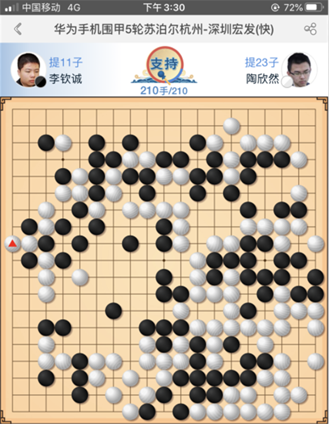 第三臺,快棋陶欣然執(zhí)白對陣?yán)顑A誠。中盤白棋打入右下黑棋模樣,黑棋應(yīng)對連續(xù)失誤,損失慘重一無所獲遂認(rèn)負(fù)。