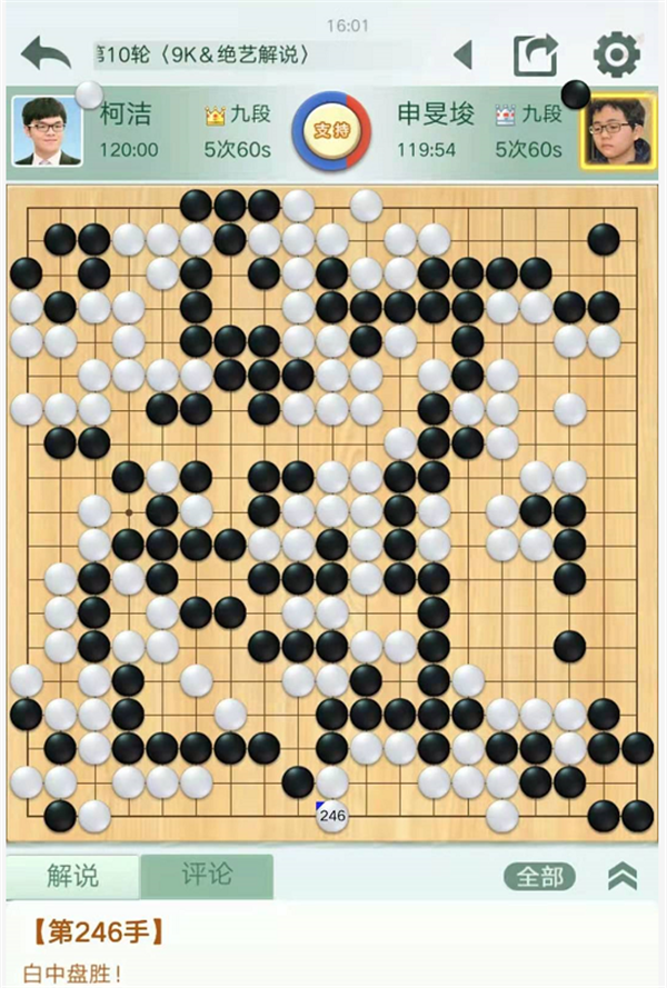 第二臺,主將臺,韓國等級分第三位的申旻俊主將執(zhí)黑對陣世界第一人柯潔。左下作戰(zhàn)黑略有所得。緊接著黑下邊行棋過分白棋抓住機會反擊后白稍好。之后左邊戰(zhàn)斗白棋下出緩手局面接近。左上白102試圖先手便宜時機不對,黑棋機敏棄去左上后又是黑棋領(lǐng)先。復(fù)雜的中央戰(zhàn)斗中白棋形狀處理不佳,導(dǎo)致巨龍成為打劫。白214找劫材時候黑應(yīng)劫敗招,消劫則黑勝勢。最終黑棋下方劫材過小,白棋消劫做活后白勝。