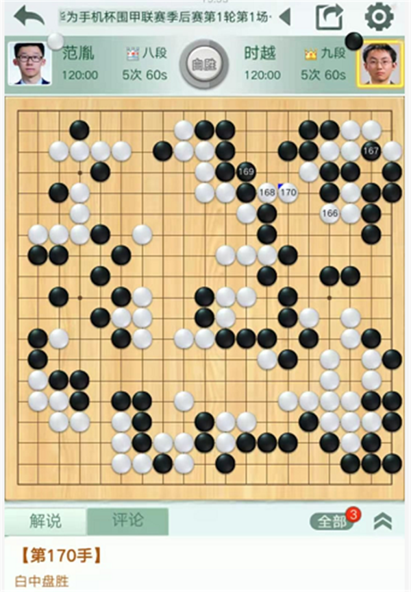 第二臺慢棋,由深圳隊的時越九段執(zhí)黑對陣民生隊的范胤八段。開局黑棋左下和左上定型都略有失誤,白棋領(lǐng)先。中盤白棋右上碰三三做劫時黑棋開劫過急,應(yīng)該下邊分開白棋較好。之后右邊白棋打入時黑棋應(yīng)對方向錯誤,又有所虧損,進(jìn)入官子時黑棋已經(jīng)差距過大,難以挽回。時越執(zhí)黑中盤負(fù)范胤。