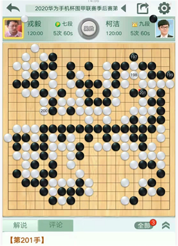 第三臺慢棋,由深圳隊的戎毅七段執(zhí)白對陣民生隊的柯潔九段。戎毅執(zhí)白對陣柯潔。開局左下變化新穎,白棋略有所得。之后右下角戰(zhàn)斗形成轉(zhuǎn)換,局面依然白好。右邊戰(zhàn)斗中黑棋形狀處理失誤,白棋簡單整形將是大優(yōu)勢局面,但是白棋選擇了復(fù)雜的殺黑大龍的變化。最后白棋選擇和黑棋互相分?jǐn)鄬⒌脑挘瑢⑹前灼逭貌恍?,實?zhàn)不得不放黑棋大龍連回后,白棋敗勢。最終戎毅執(zhí)白中盤負(fù)柯潔。