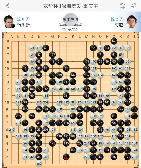 一臺戎毅執(zhí)黑對陣李軒豪,右上戰(zhàn)斗后黑棋稍有優(yōu)勢,之后黑棋沖擊中央白棋過分,應該慢慢收官,白棋正確應對,戰(zhàn)斗中便宜后獲得勝利。二臺主將時越執(zhí)白對陣等級分排名第二的楊鼎新,中盤黑棋打入右邊后形成亂戰(zhàn),白棋失誤比黑棋更多,戰(zhàn)斗結束進入官子時黑勝勢。