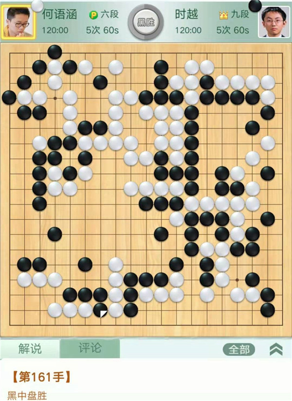 緊接著,一臺時(shí)越九段執(zhí)黑對何語涵六段干凈利落,時(shí)越在對局中充分發(fā)揮自身勢大力沉的棋風(fēng),以凌厲的屠龍刀法絕殺一條大龍,痛快淋漓地結(jié)束了戰(zhàn)斗。關(guān)鍵節(jié)點(diǎn)在中盤,黑棋對右邊白子簡單吃住尾巴則優(yōu)勢,實(shí)戰(zhàn)黑棋追求整體殺白,白棋應(yīng)對失誤大龍憤死,行棋161手。