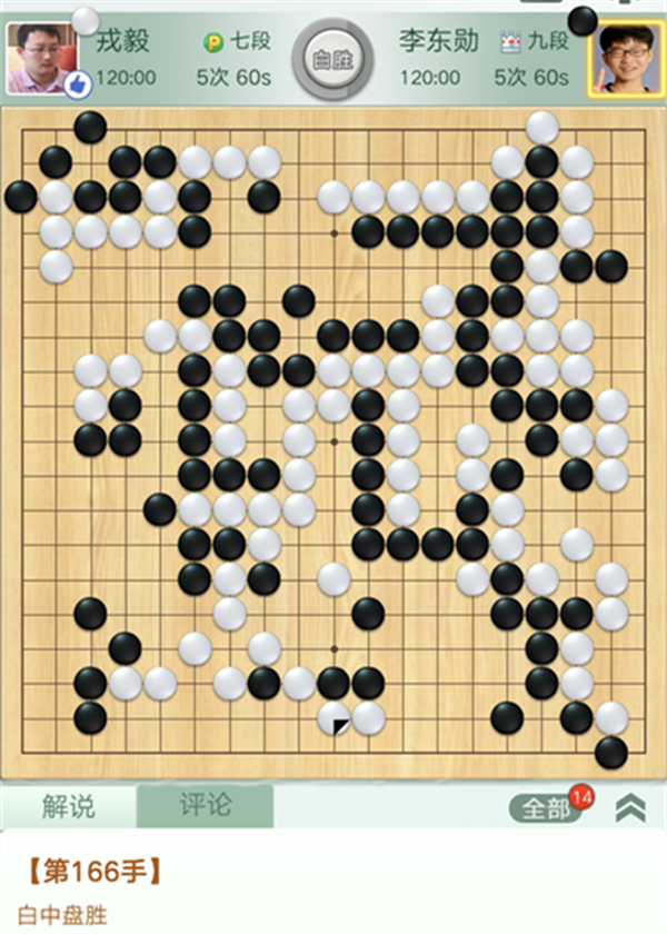 龍華隊(duì)戎毅七段本輪重新披掛上陣,執(zhí)白對(duì)陣韓國(guó)排名第四的李東勛。開局二十幾手時(shí),黑在左上出現(xiàn)重大失誤,白棋大幅領(lǐng)先。之后,白思路清晰,掌控局面,優(yōu)勢(shì)逐漸擴(kuò)大,而速勝。