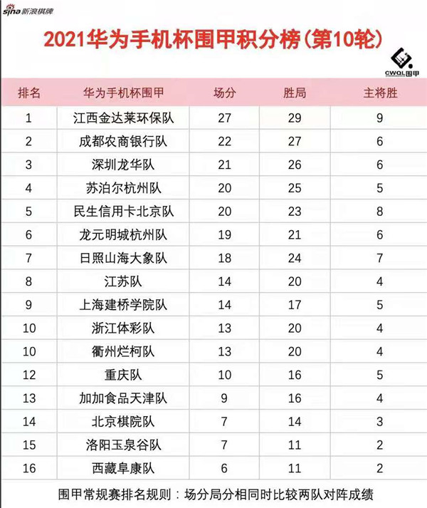 讀特客戶端?深圳新聞網(wǎng)2021年6月12日訊(記者周錦春)華為手機(jī)杯男子圍甲聯(lián)賽第二階最后一輪比賽今日塵埃落定,16圍甲隊(duì)伍可以暫時(shí)偃旗息鼓,安安心心地享受端午節(jié)的快樂時(shí)光了。第十輪深圳龍華隊(duì)對(duì)陣龍?jiān)鞒呛贾蓐?duì),以1:3再次敗退一步,從積分榜第二的位置降至第三,江西隊(duì)金達(dá)萊環(huán)保隊(duì)、成都農(nóng)商銀行隊(duì)分居狀元、榜眼之位。圍甲第三階段比賽預(yù)計(jì)在8月底繼續(xù)在浙江長(zhǎng)興進(jìn)行。