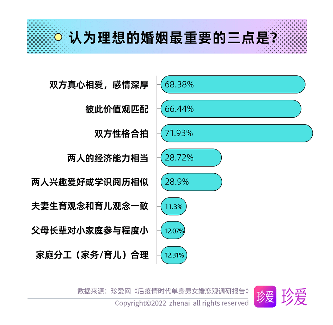 經(jīng)歷過疫情后,居家期間的家庭生活或他人的故事也令單身青年們對婚姻有了新的理解,調(diào)查顯示,理想的婚姻最重要的因素為彼此性格合拍(71.93%),高于雙方真心相愛(68.38%)和兩人的價值觀匹配(66.44%)。
