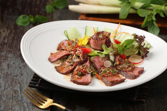 牛肉被貼心地切成小塊,以辣椒醬、檸檬汁、魚露、香茅、蒜頭、蠔油等調(diào)味料先醃漬入味,煎至表皮微焦後再烘烤,微透著肉粉色就知道多鮮嫩又不失咬勁,微辣帶酸的滋味,令人印象深刻。