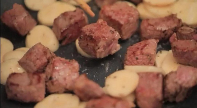5、將牛肉粒加入煎鍋中,稍微煎到5成熟,加入厚蒜片,兜炒一番,后加入少許油,否則無(wú)法爆炒到蒜片;