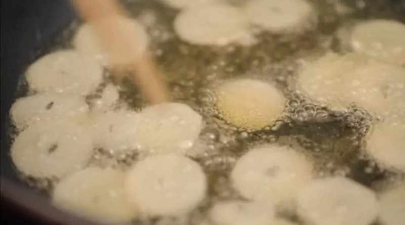 3、開(kāi)煎鍋,加油,將薄片的蒜片放入鍋中炸,需要攪開(kāi)來(lái),否則粘在一起就炸不脆??吹剿忸^有一些泡泡出來(lái)了,炸到?jīng)]有泡泡就可以了。將炸到金黃色的蒜片夾起,放在廚房用紙上,過(guò)濾掉油脂;