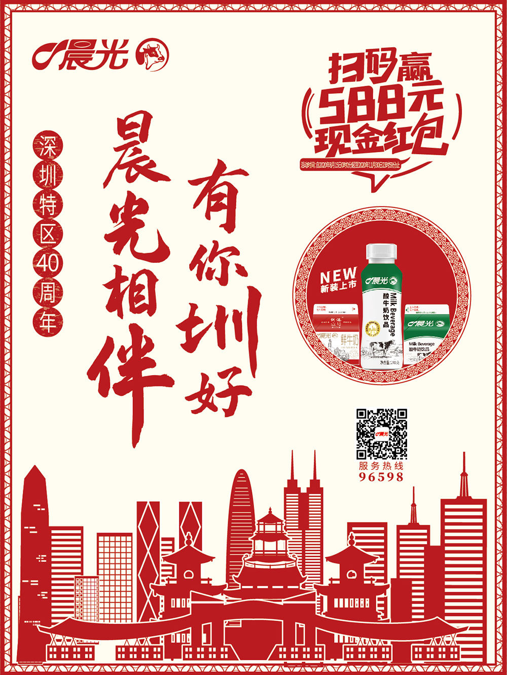 見圳客戶端·深圳新聞網(wǎng)2020年8月25日訊 作為深圳本土的國營乳制品公司,晨光乳業(yè)以“深圳特區(qū)40周年,晨光相伴,有你圳好”為主題,致敬深圳經(jīng)濟(jì)特區(qū)建立40周年。作為一家“深圳老字號(hào)”品牌企業(yè),晨光乳業(yè)以40周年為契機(jī),推出全新升級(jí)包裝的240g酸牛奶飲品以及掃碼贏588元紅包等多個(gè)主題活動(dòng),在與千萬深圳市民分享晨光40年的喜悅之情的同時(shí)共慶深圳經(jīng)濟(jì)特區(qū)成立40周年!