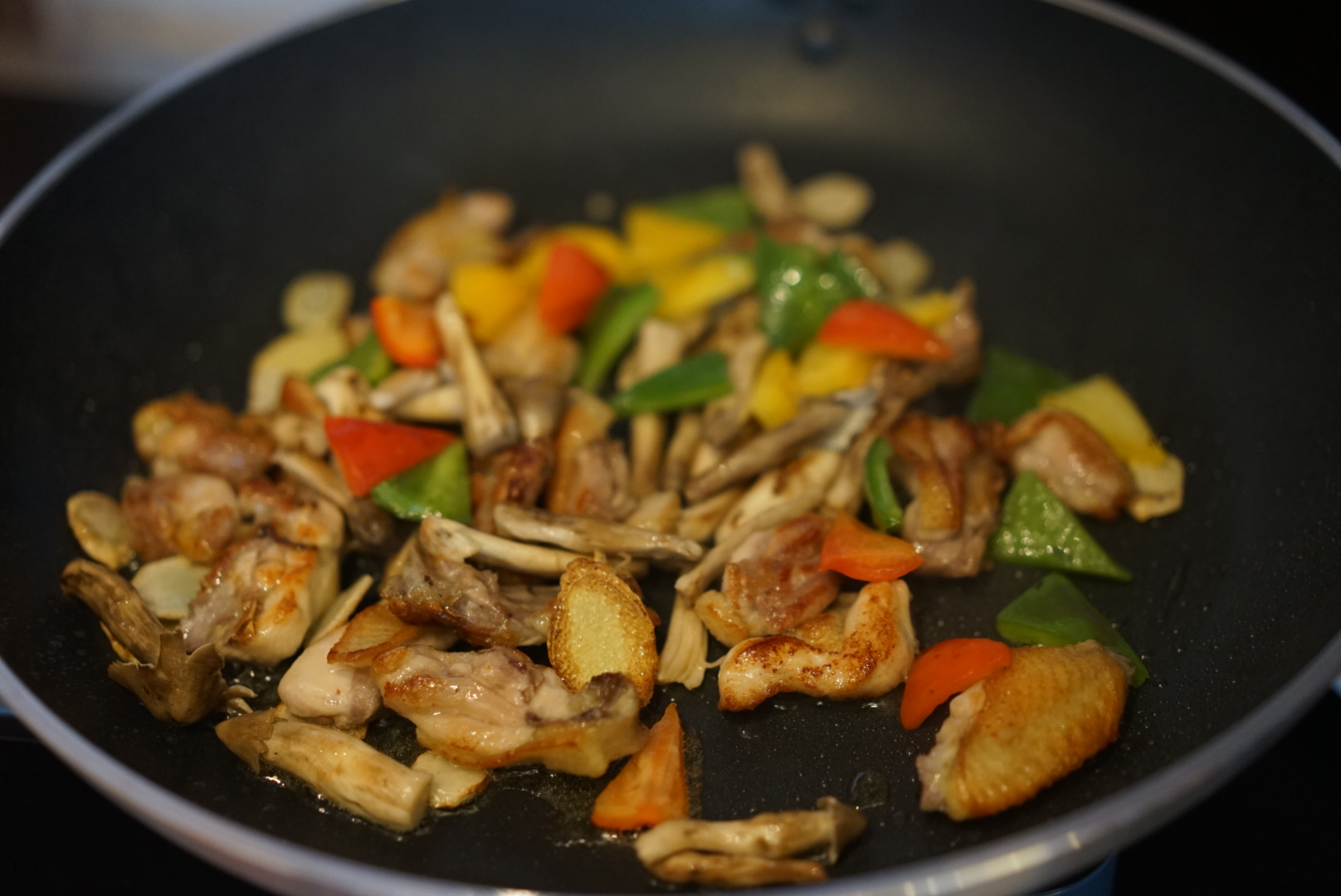 3、等雞肉大約7成熟時,加入沙姜片,用鐵勺輕輕兜炒雞肉與姜片,讓雞肉更加充分吸收姜的風味。雞皮經(jīng)油溫加熱后,油脂滲出,將鍋中的油勺起,再淋到雞件與姜片上,充分融合。