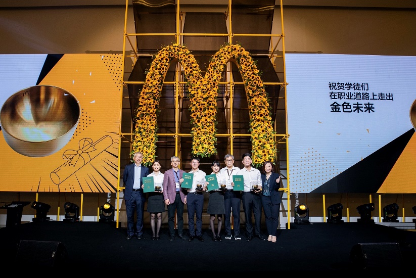 麥當勞領導們、陳李翔和陳宇向四位首批畢業(yè)生代表贈送“出師證”和金碗,并向未來學徒發(fā)出邀請