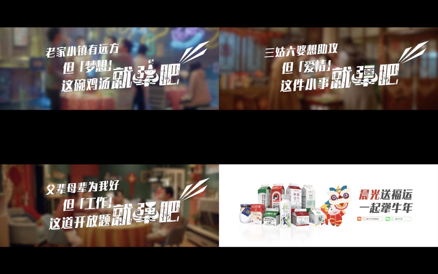 1月29日,晨光乳業(yè)《就犟吧》賀歲TVC微信、朋友圈正式上線,就春節(jié)熱門話題“結婚、找穩(wěn)定工作、要不要外出追夢”進行了生動演繹。在熱鬧喜慶的年節(jié)氛圍中,趣味反轉的劇情,形象展現了新一代年輕人對于工作、愛情、夢想“不服輸、敢堅持”的態(tài)度。