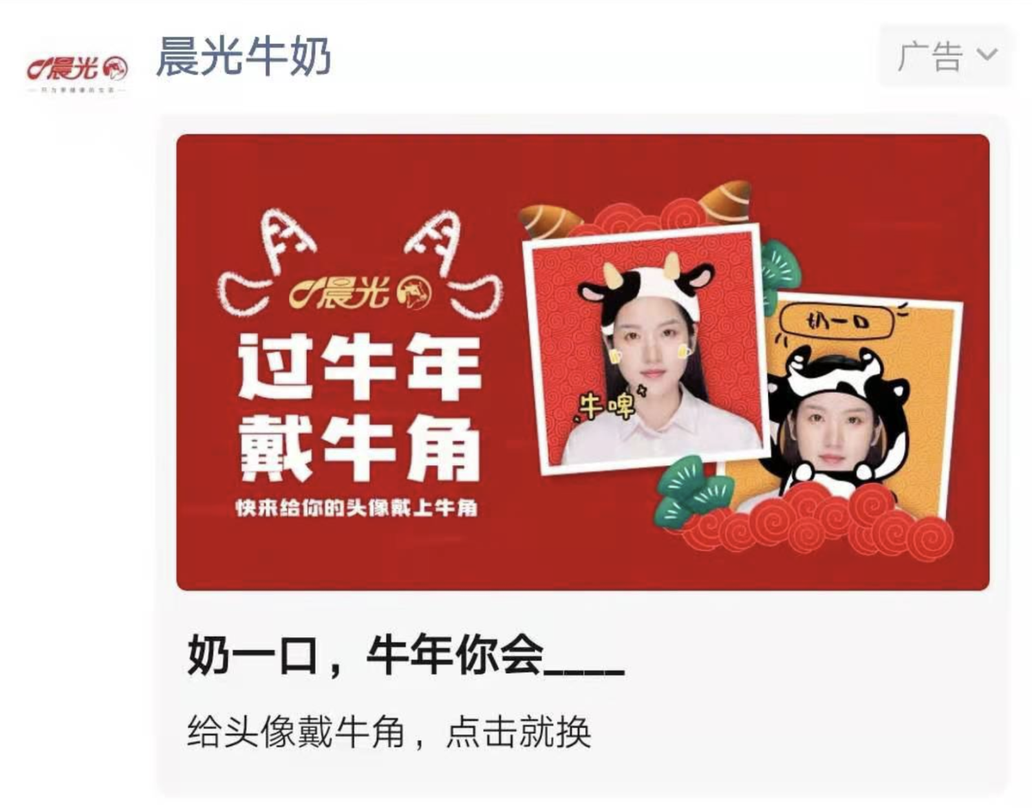 春節(jié),正是各大品牌爭相出招時刻,如何在一眾營銷活動中突出重圍吸引用戶關注?洞察到用戶在春節(jié)期間“換個喜慶頭像”以及“發(fā)紅包”的強需求,晨光乳業(yè)趣味游戲H5“換個頭像犟牛年”和“定制紅包”于除夕前上線,邀請用戶為現有微信頭像戴上“牛角”。牛角頭像不僅可以用于微信,也可用于其他社交平臺。