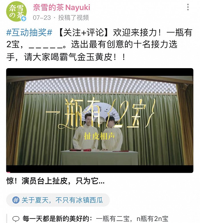 在此之前,奈雪曾用“說相聲”的方式推霸氣金玉黃皮,讓茶飲和相聲組CP;霸氣生椰斑斕上架時,他們出了個東南亞風(fēng)滿滿的視頻,仿佛一秒到了泰國,創(chuàng)意有趣的同時,也讓消費者對產(chǎn)品留下深刻印象。