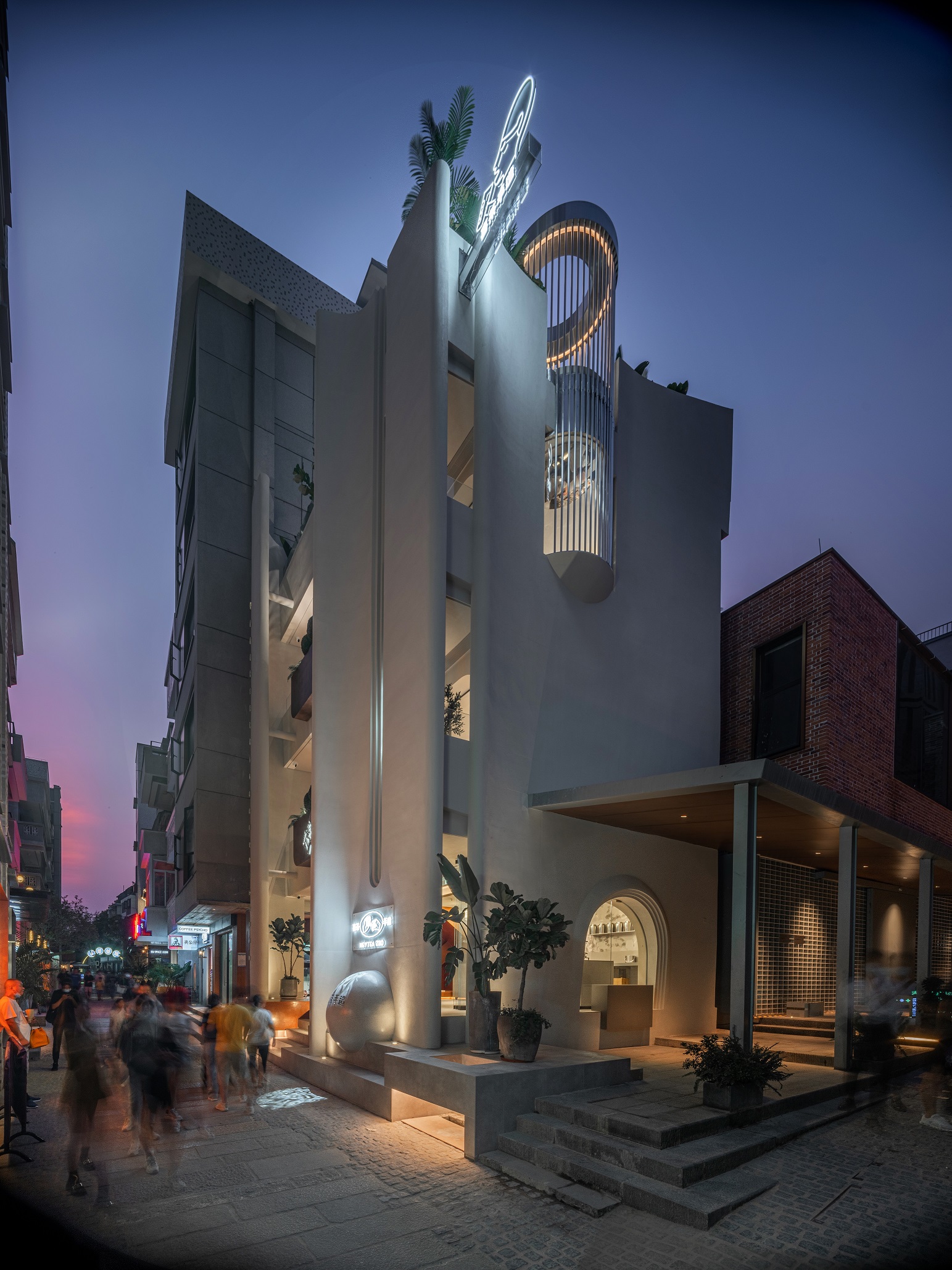 當(dāng)顧客走近門店,店前刻印“喜茶手造”字樣的球狀石塊上方采用水滴狀投影,擬態(tài)自然水滴,展現(xiàn)喜茶天然追求。抬頭望去,二樓走廊花槽采用手鑿銀質(zhì)感材料打造喜茶 Logo,充分突出門店手造特點。