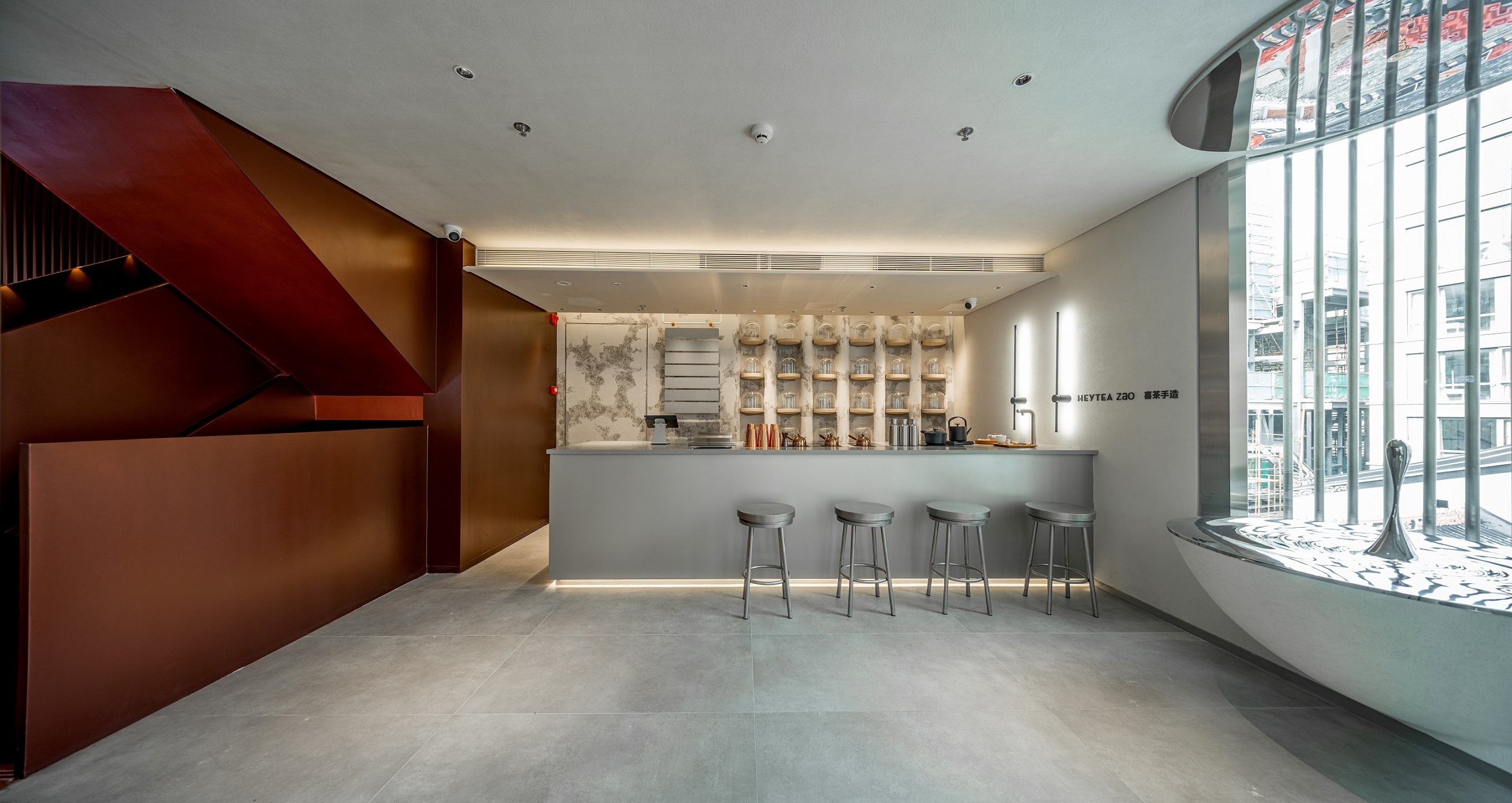 在內(nèi)部設(shè)計上,喜茶同樣以創(chuàng)新的功能空間設(shè)置和突破性設(shè)計,呼應(yīng)每一樓層的手造主題,升級了消費者的空間體驗。喜茶將一樓正門墻體改造為玻璃移門,塑造出通透的門店空間;變封閉窗戶為開放的門,讓顧客看得見手造產(chǎn)品的全過程。此外,在用色與材質(zhì)搭配上,門店內(nèi)部整體采用嶺南復(fù)古紅與現(xiàn)代極簡白搭配,做舊復(fù)古肌理漆與現(xiàn)代化金屬材質(zhì)呼應(yīng),不僅有效進(jìn)行功能分區(qū),還體現(xiàn)歷史感與現(xiàn)代感的對比、融合。