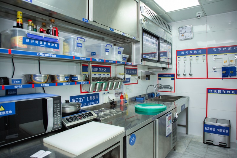“右手邊是冷菜間,因?yàn)槭嘲惨蟾撸覀兌加袑iT的‘二次更衣室’,在這里更換衣服后,再進(jìn)入對涼菜進(jìn)行處理?!必?fù)責(zé)人表示,在專門的涼菜區(qū)里,則可以看到櫥窗中整齊地貼上了諸如“A1圣女果”“B04魚豆腐”之類的標(biāo)簽,同時備注“當(dāng)天生產(chǎn)打烊廢棄”和“加工日期與廢棄日期”等具體操作指示?!懊客泶蜢群?,我們也會用紫外線燈對冷菜間進(jìn)行半個小時的消毒?!必?fù)責(zé)人補(bǔ)充。