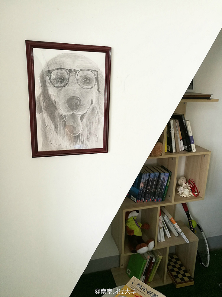 墻上一幅戴著眼鏡的小狗素描圖格外引人注目,它是由602舍長涂貴平親手畫的?!斑@幅畫還是去年自己參加了一個帶有公益性質(zhì)的畫畫班學的,我也沒想到能畫成這樣?!眮碜再F州的涂貴平害羞地說,其實裝飾寢室的初衷很簡單,錢就花了300塊不到,主要是希望大學四年能住在干凈的環(huán)境。