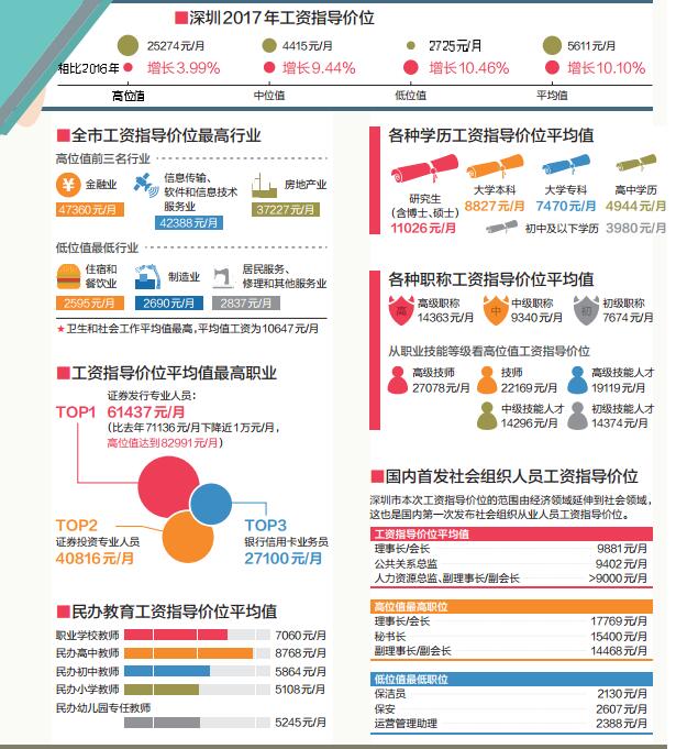 由深圳市人社局發(fā)布的《2017年深圳市人力資源市場工資指導(dǎo)價(jià)位》顯示,2017年,深圳工資指導(dǎo)價(jià)位平均值為5611元/月,比去年上漲10.10%。