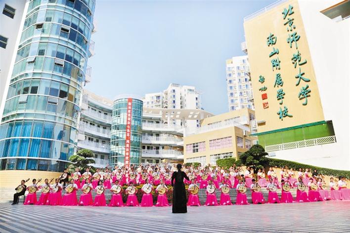 發(fā)掘民族器樂個性,傳承優(yōu)秀文化精髓,既是藝術(shù)工作者的一種情懷,更是教育工作者的一種使命。北京師范大學(xué)南山附屬學(xué)校小學(xué)部秉承實施“個性化素質(zhì)教育”的辦學(xué)理念,在“校園七色花,朵朵都精彩”的學(xué)生發(fā)展觀指引下,于2013年10月組建了深圳市第一支少兒阮樂團(tuán),樂手平均年齡10歲,是國內(nèi)平均年齡最小的阮樂團(tuán)。經(jīng)過數(shù)年的努力,樂團(tuán)發(fā)展到百人規(guī)模,頻頻登上國內(nèi)外高規(guī)格平臺演出,成為享譽(yù)國內(nèi)外的少兒阮樂團(tuán)。在第二批全國中小學(xué)中華優(yōu)秀傳統(tǒng)文化藝術(shù)傳承校中,北京師范大學(xué)南山附屬學(xué)校實力上榜。