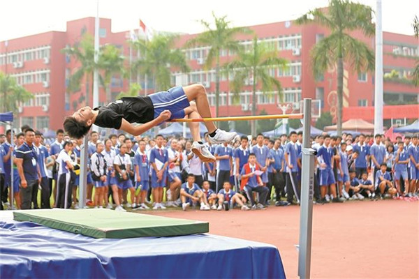 ▲沙井中學學生在第十四屆體育藝術(shù)節(jié)田徑運動會跳高比賽中表現(xiàn)精彩。