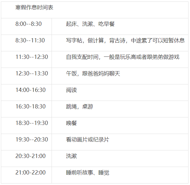 為了不大眼瞪小眼,我和孩子一起制定了一張計(jì)劃表如下: