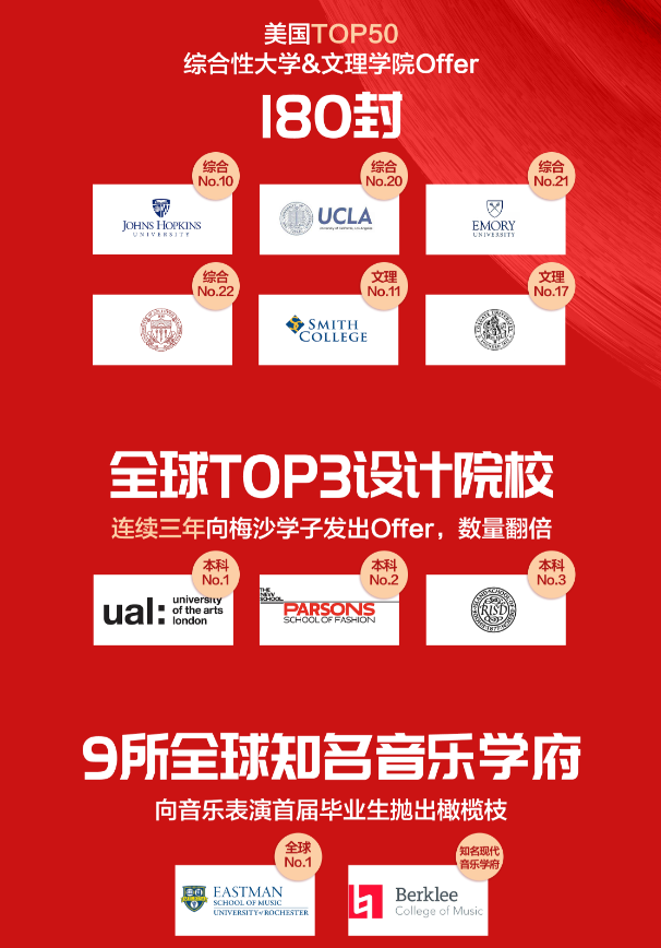 2020申請(qǐng)季還未結(jié)束,梅沙學(xué)子已收獲494封海外名校錄取Offer,獎(jiǎng)學(xué)金累計(jì)約合人民幣1,960萬(wàn)元,創(chuàng)三年新高。其中,來(lái)自美國(guó)Top100綜合性大學(xué)及文理學(xué)院的錄取通知書有356份,來(lái)自美國(guó)Top50綜合性大學(xué)及文理學(xué)院的錄取通知書有180份。