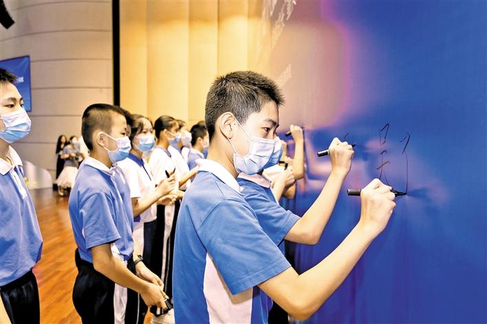 “自覺遵守互聯(lián)網(wǎng)相關(guān)政策和法律法規(guī),積極培育和踐行社會主義核心價值觀……”海韻學(xué)校的學(xué)生們現(xiàn)場朗讀《寶安青少年“文明上網(wǎng)·健康成長”倡議書》,并在承諾墻上莊嚴(yán)地簽下自己的名字。