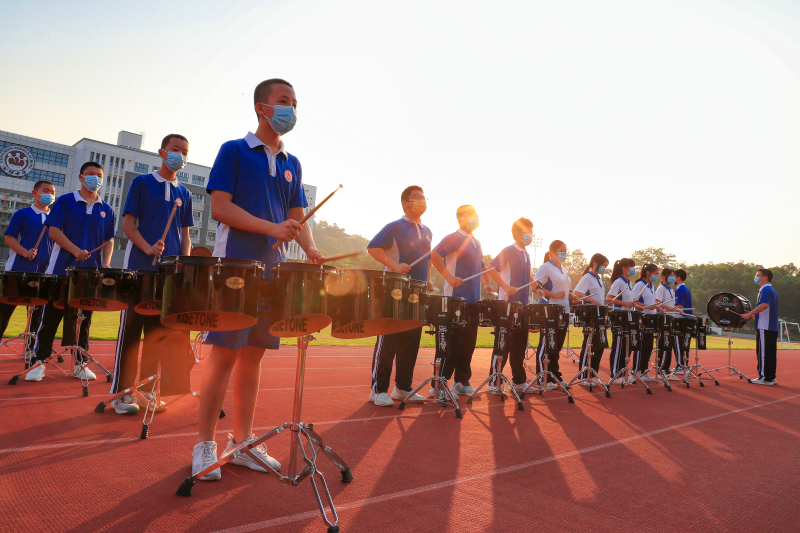 公明中學(xué)打擊樂團(tuán)用歡快的鼓聲為學(xué)子們加油助威。(公明中學(xué)供圖)