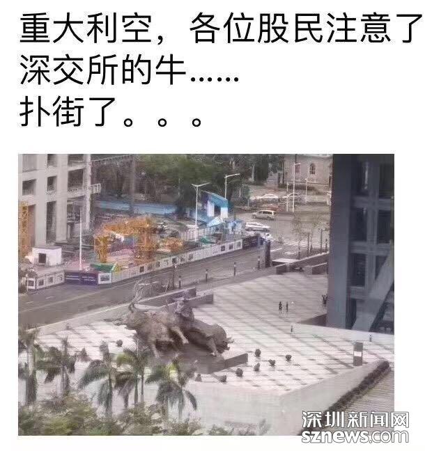 深圳新聞網(wǎng)9月18日訊(記者 張玲 實(shí)習(xí)生歐陽(yáng)子瑜 張林羽 陸宇)關(guān)于“山竹”的各種段子特別多,博君一笑,未必是真。記者18日發(fā)現(xiàn),有一張像素極低的圖在網(wǎng)上流傳,照片中一頭牛雕塑臥倒在地,配文是:重大利空,各位股民注意了,深交所的牛,撲街了……