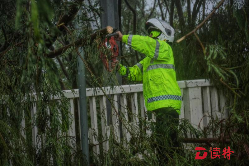 面對強大的臺風(fēng),艾力軍感到焦急又無奈?!罢娴氖锹穬膳缘臉湟豢每玫脑谖已矍暗瓜?疏通不完的排水口,清理不完的倒樹?!卑妼τ浾哒f。即便如此,他還是帶領(lǐng)隊員不斷的在風(fēng)雨中努力嘗試不讓路被積水、倒樹堵死,一次次下車排除險情。